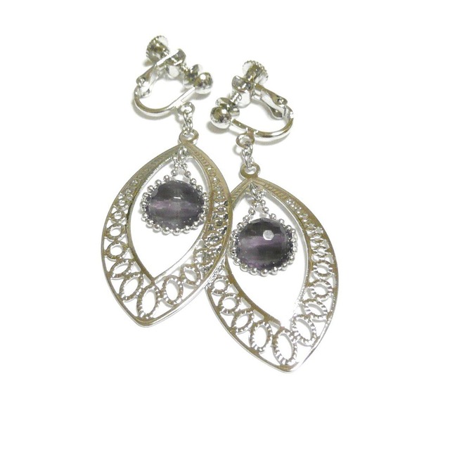 高貴なお色に澄んだアメジストが、 マーキスフレームの中で揺れるイヤリングです。 【 アメジストイヤリング 】 ・主体石:アメジスト/紫水晶(8mmカット珠)×2 ・金属素材:ブラス製 ・イヤリング金具:ブラス製ネジバネ式 (軽く、装着時の負担が極めて少ないオススメのイヤリング金具です。) ・仕上げ:貴金属メッキ(ロジウムコート) (いわゆるPt900等の、プラチナのジュエリーと同じお色のメッキです。) ~付属品~ ・保管&携帯用特製ポーチ 末永くご愛用頂けますように、 お買い求め後のアフターサービスに関しましても万全の体制を整えております。 どうぞご安心の上、お求め下さいませ。 同じデザインでピアスのお品もございます。 「 アメジスト ピアス マーキス フレーム 」と検索なさりご覧下さい。
