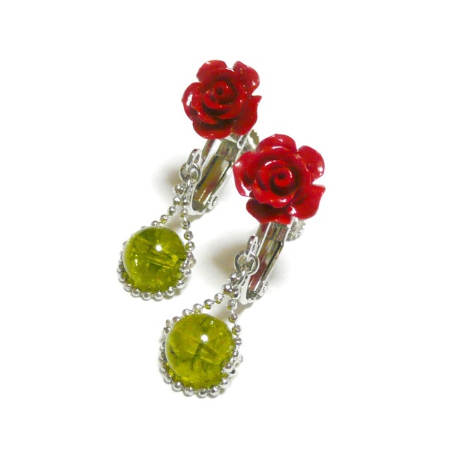 赤珊瑚 薔薇 10mm ペリドット 8mm 連なる イヤリング コーラル フラワー 【 印象派 】