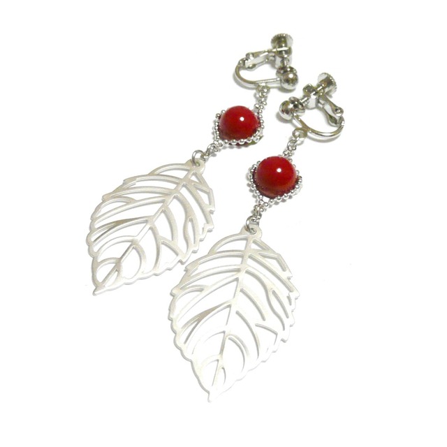 鮮やかな真紅に染められたサンゴが、 大きな葉っぱのチャームと共に揺れるイヤリングです。 【 珊瑚イヤリング 】 ・主体石:染め赤さんご/レッドコーラル(海竹/8mm丸珠)×2 ・金属素材:ブラス製 ・イヤリング金具:製ネジバネ式 (軽く、装着時の負担が極めて少ないオススメのイヤリング金具です。) ・仕上げ:貴金属メッキ(ロジウムコート) (いわゆるPt900等、プラチナのお色のメッキです。) ~付属品~ ・保管&携帯用特製ポーチ 末永くご愛用頂けますように、 お買い求め後のアフターサービスに関しましても万全の体制を整えております。 どうぞご安心の上、お求め下さいませ。 同じデザインでピアスのお品もございます。 「 赤珊瑚 ピアス 大きな葉っぱ 」と検索なさりご覧下さい。