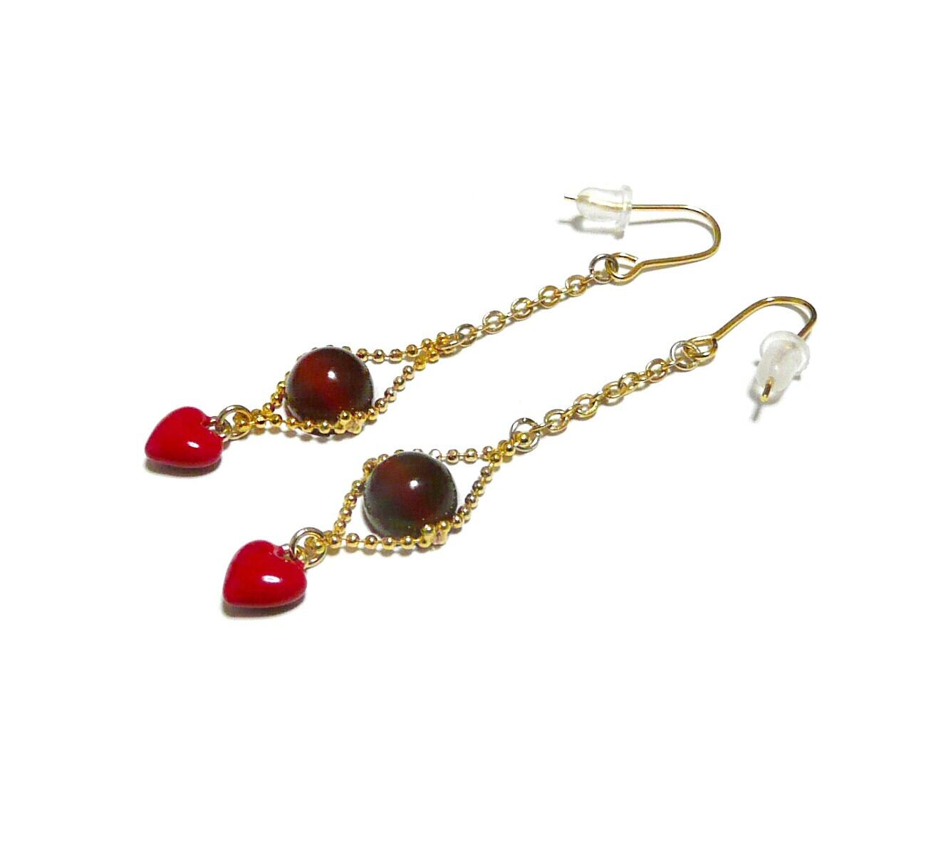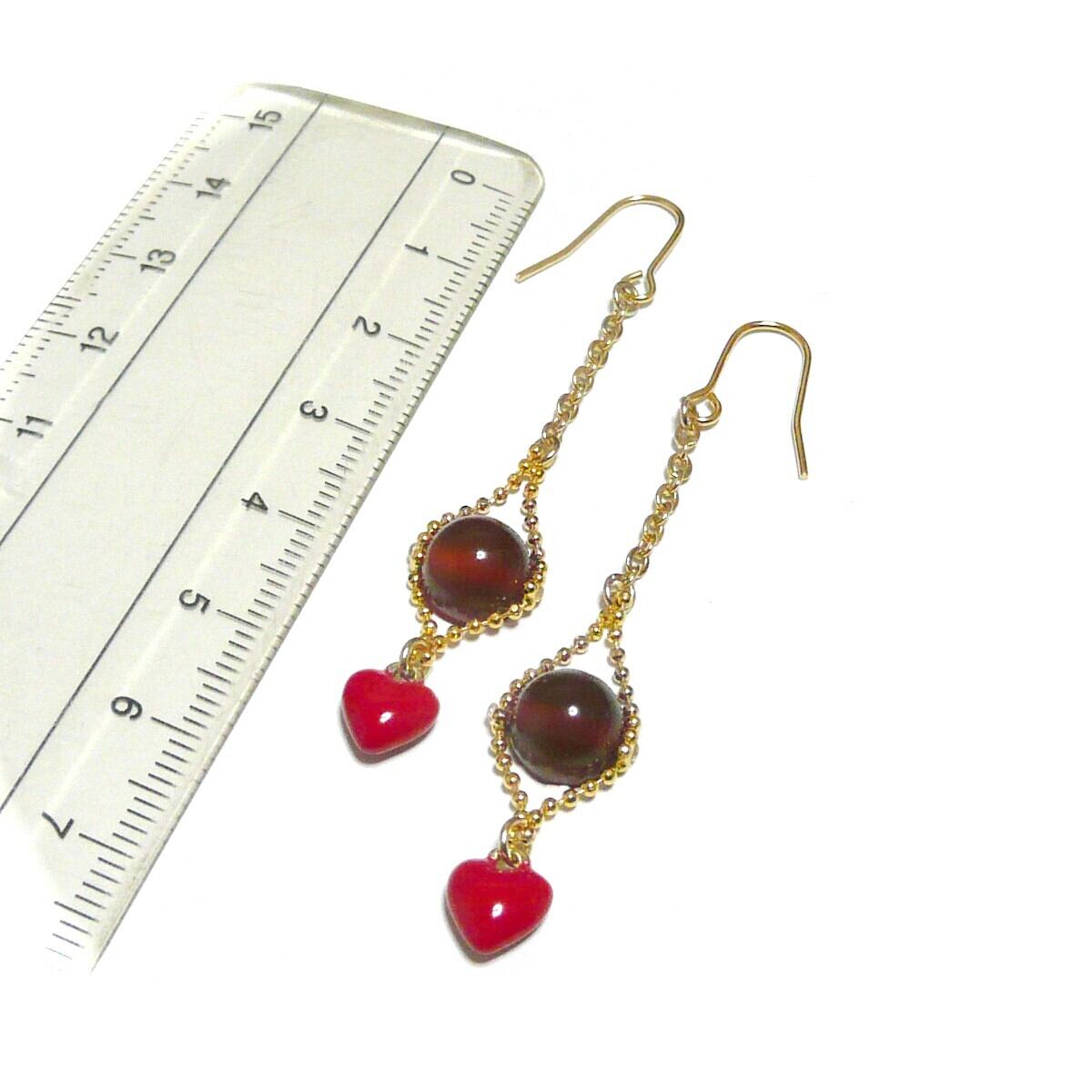 エポキシ彩色されたハートのチャームと共に揺れるロングピアスです。