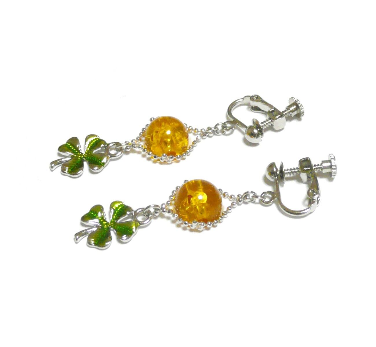 大粒のイエローアンバーと四葉のクローバーのイヤリング