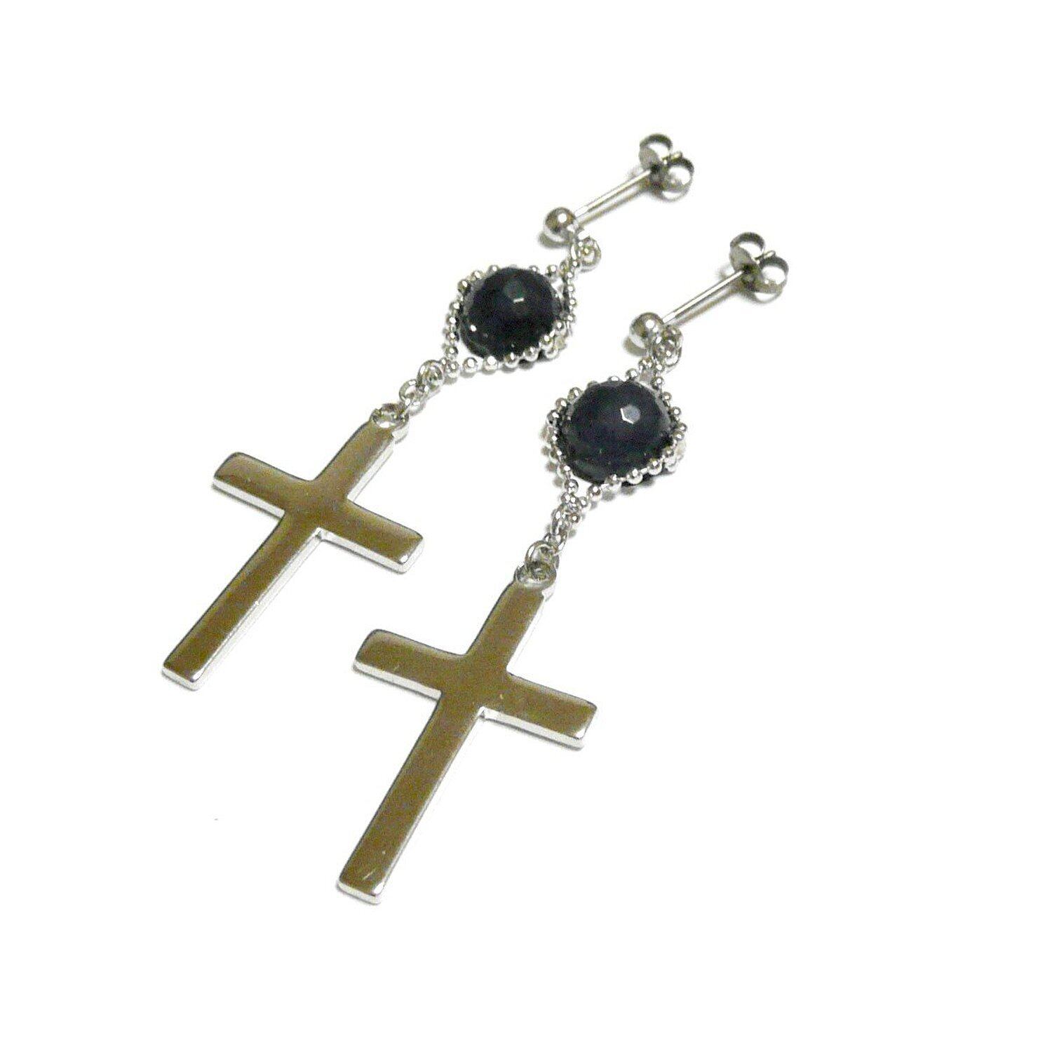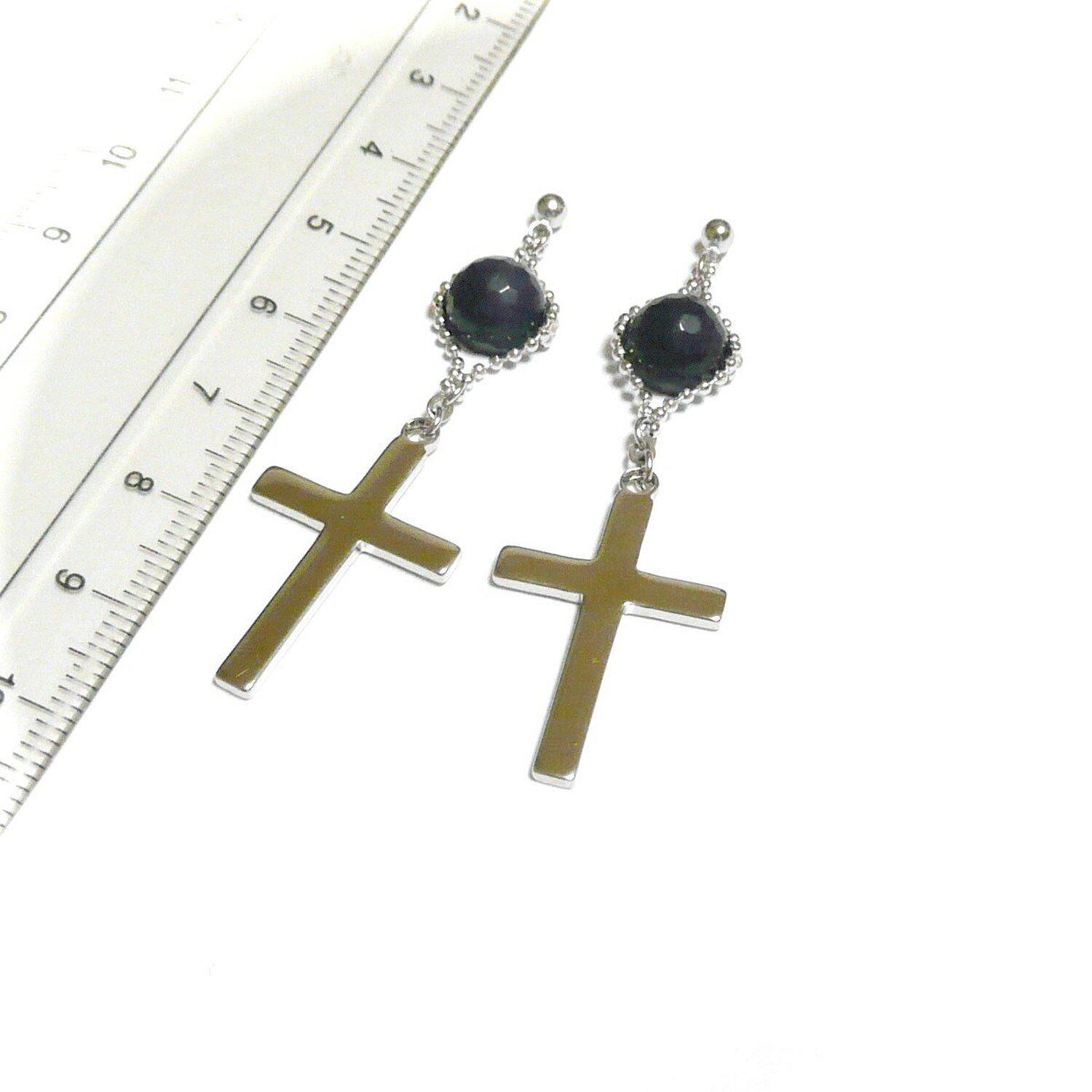 大きな十字架のチャームと共に揺れるスタッズタイプのピアスです。