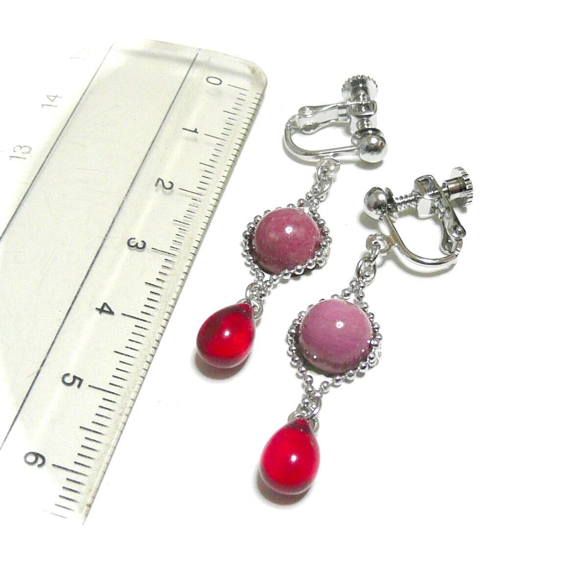 しずくカットの小さな赤いコハクと連なり揺れるイヤリングです。