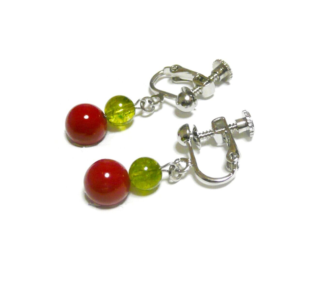ペリドットと鮮やかな真紅の染め赤珊瑚が繋がるイヤリングです。