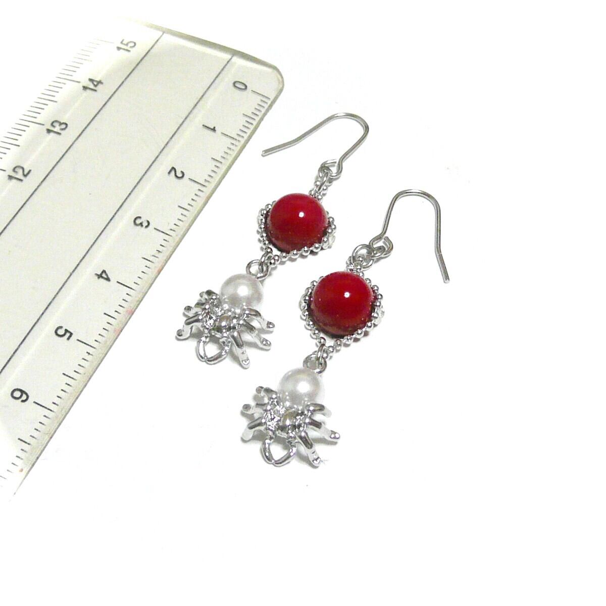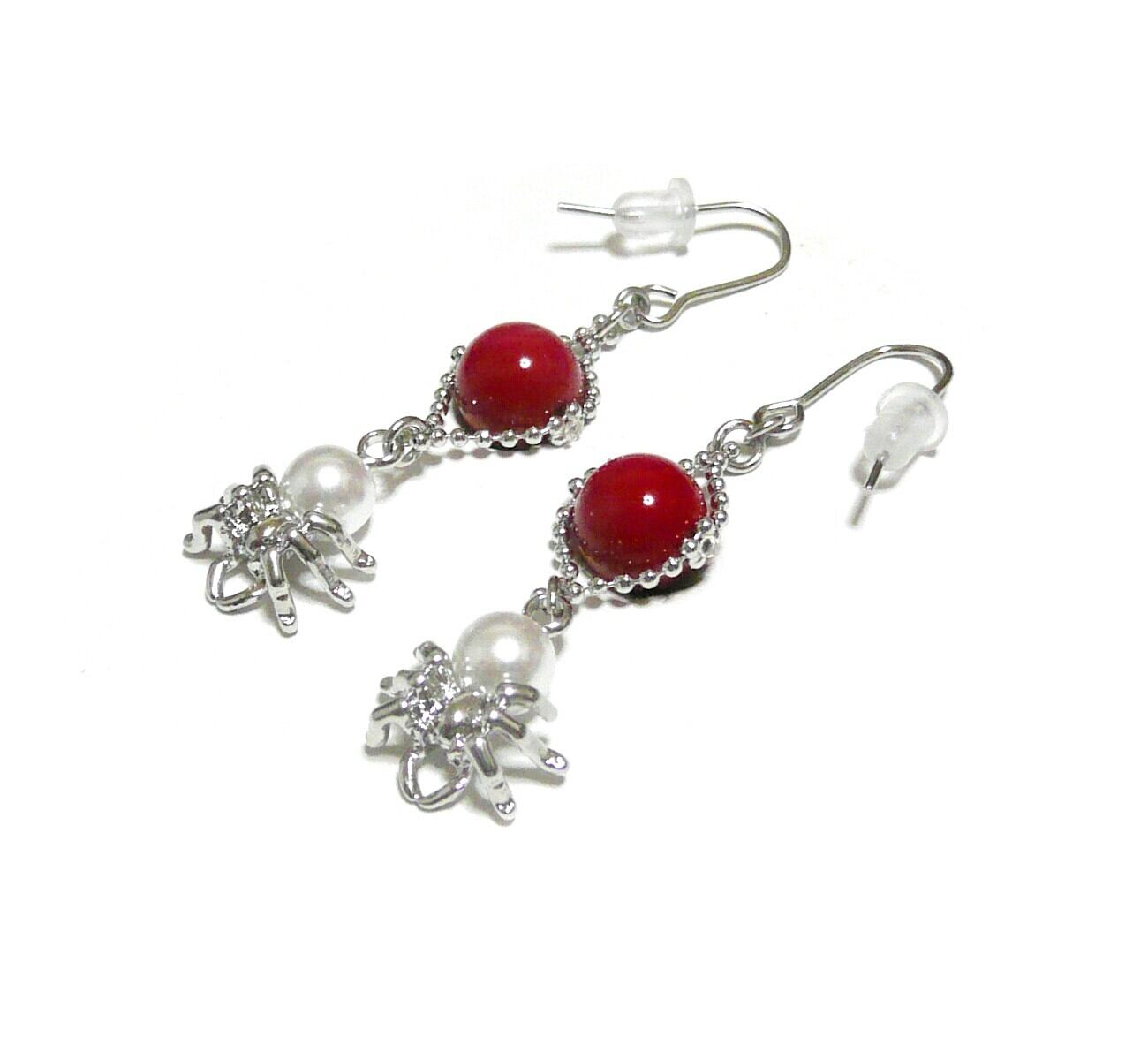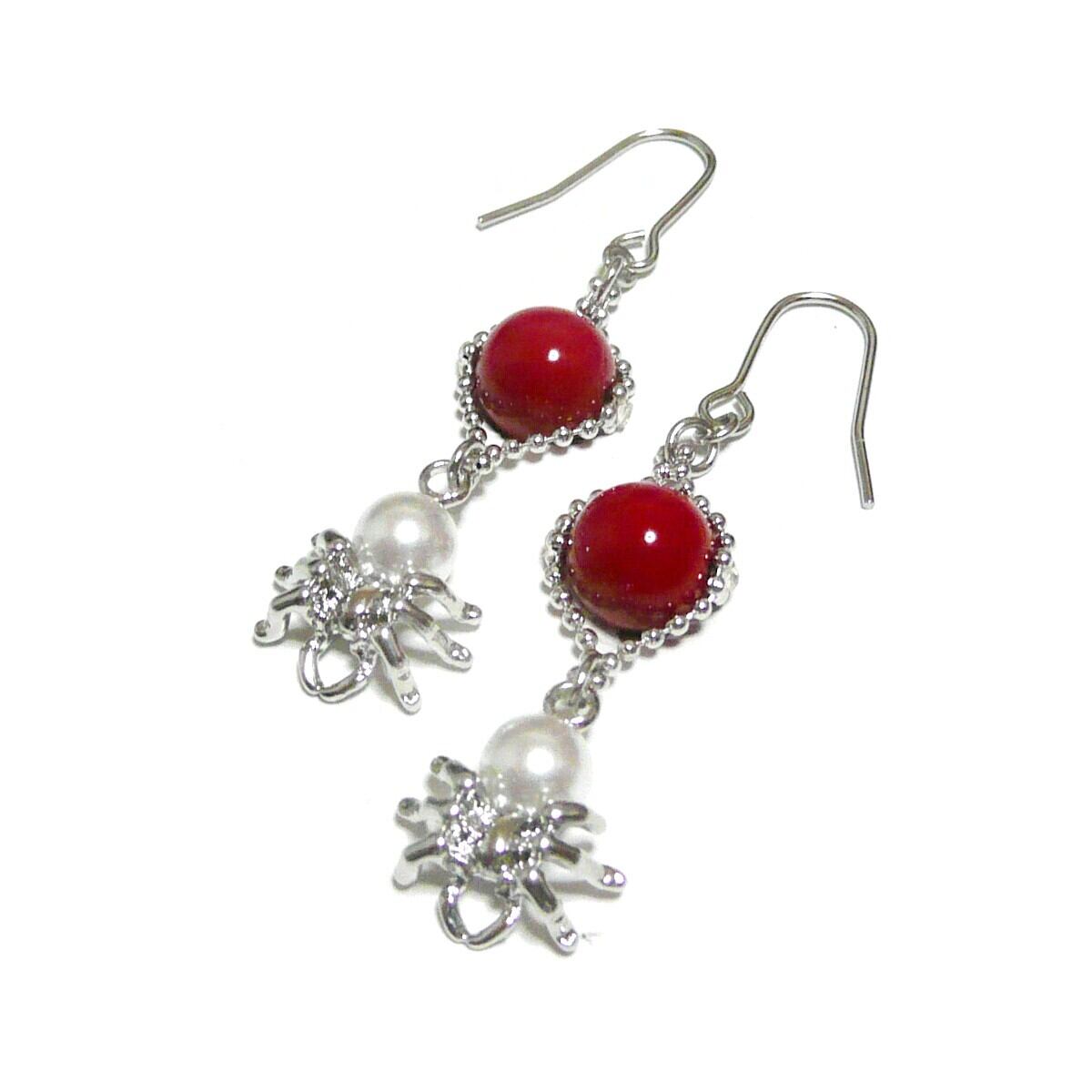 赤珊瑚 ピアス 蜘蛛 パール さんご 真珠クモ 銀色 シルバーカラー