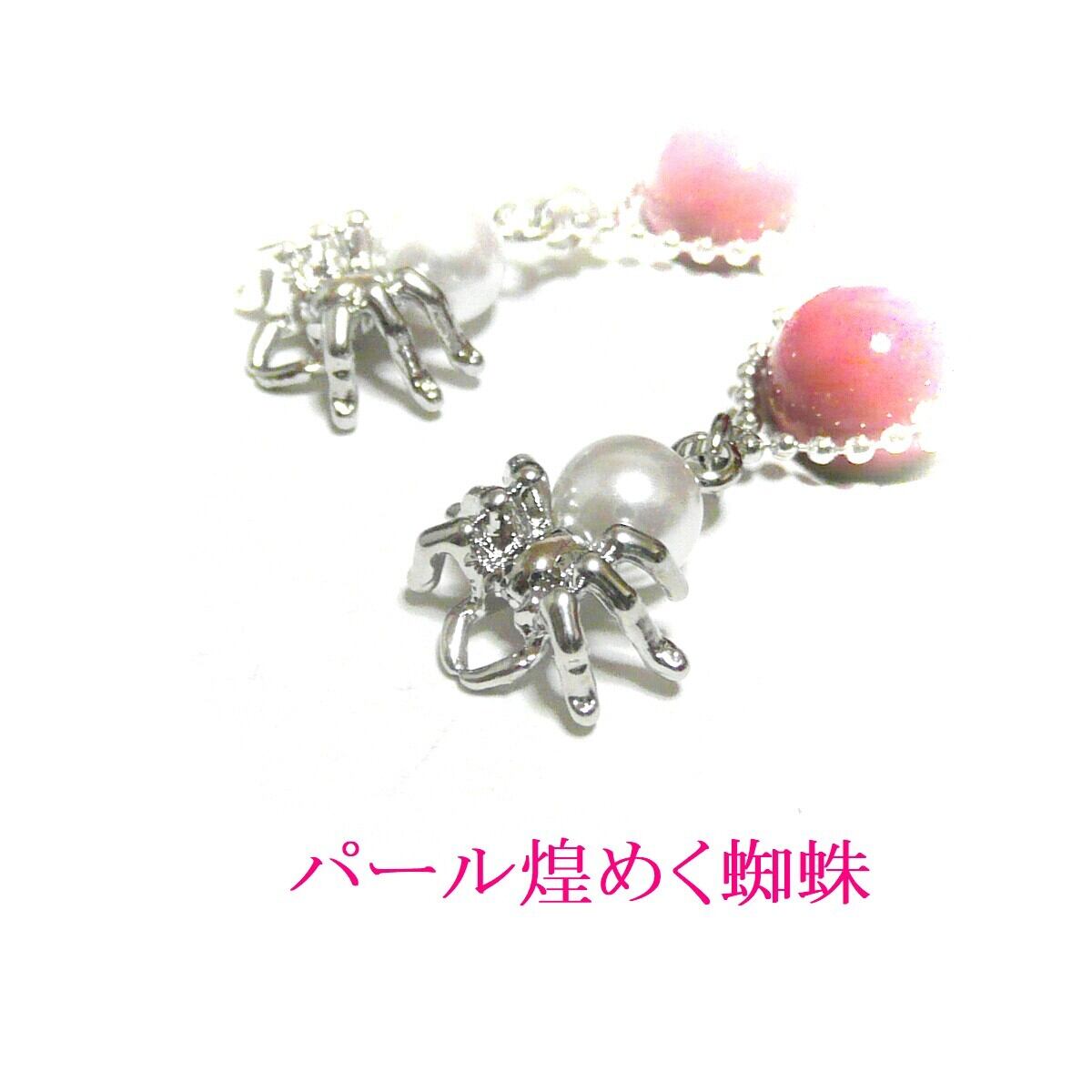 パールを纏ったクモのチャームと共に揺れるピアスです。