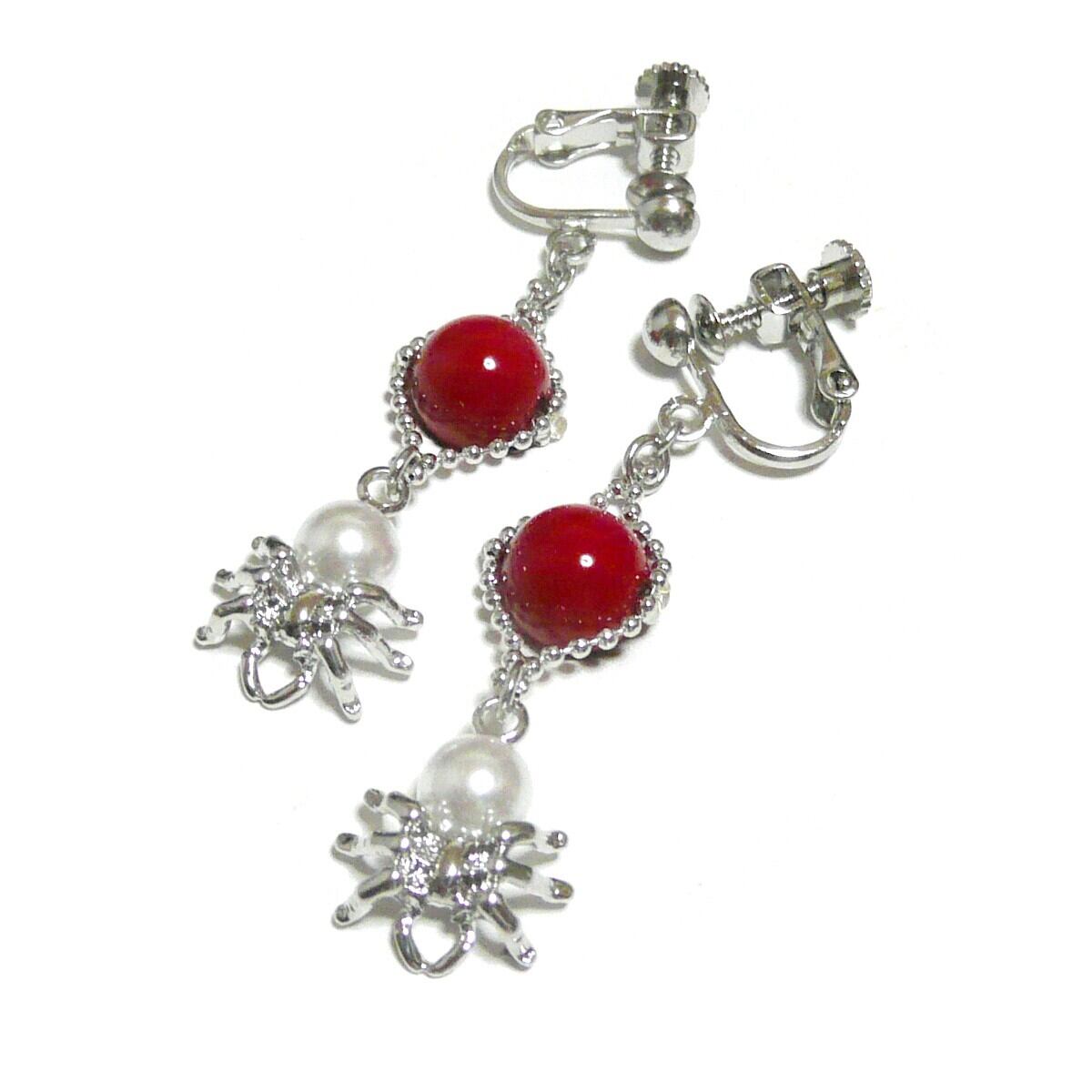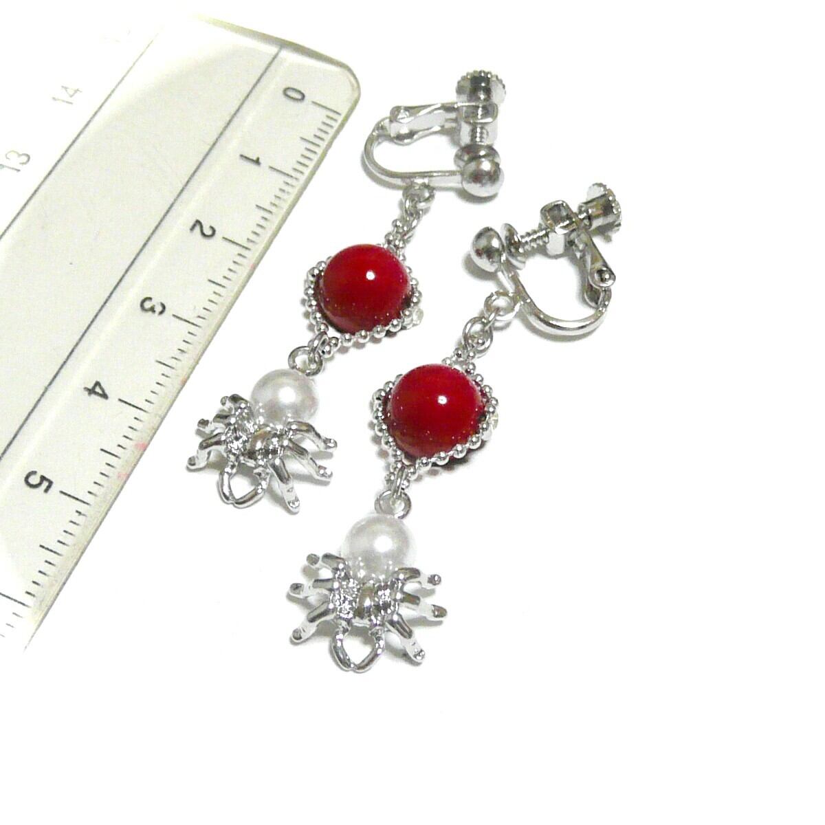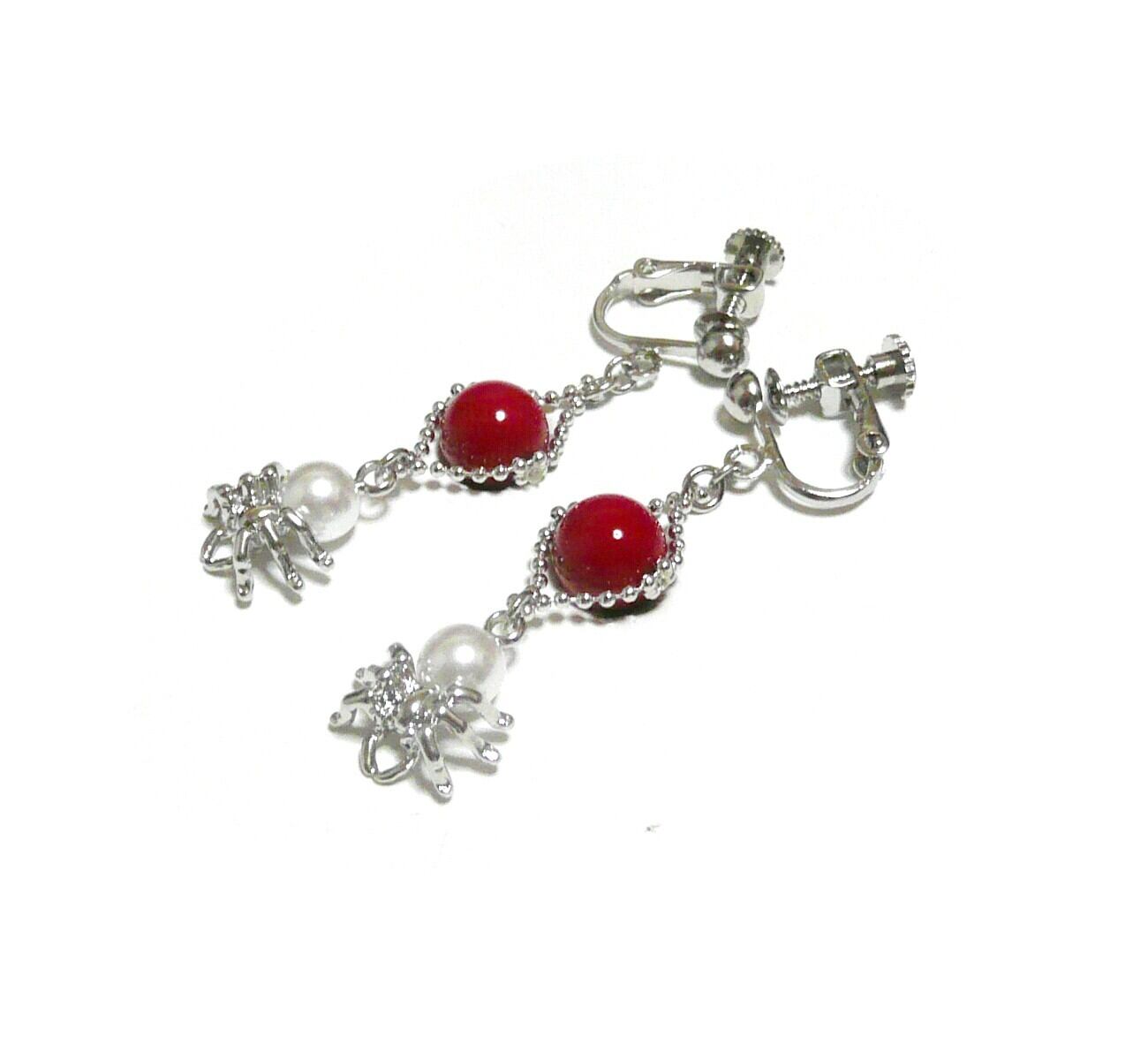 赤珊瑚 イヤリング 蜘蛛 パール さんご 真珠クモ 銀色 シルバーカラー