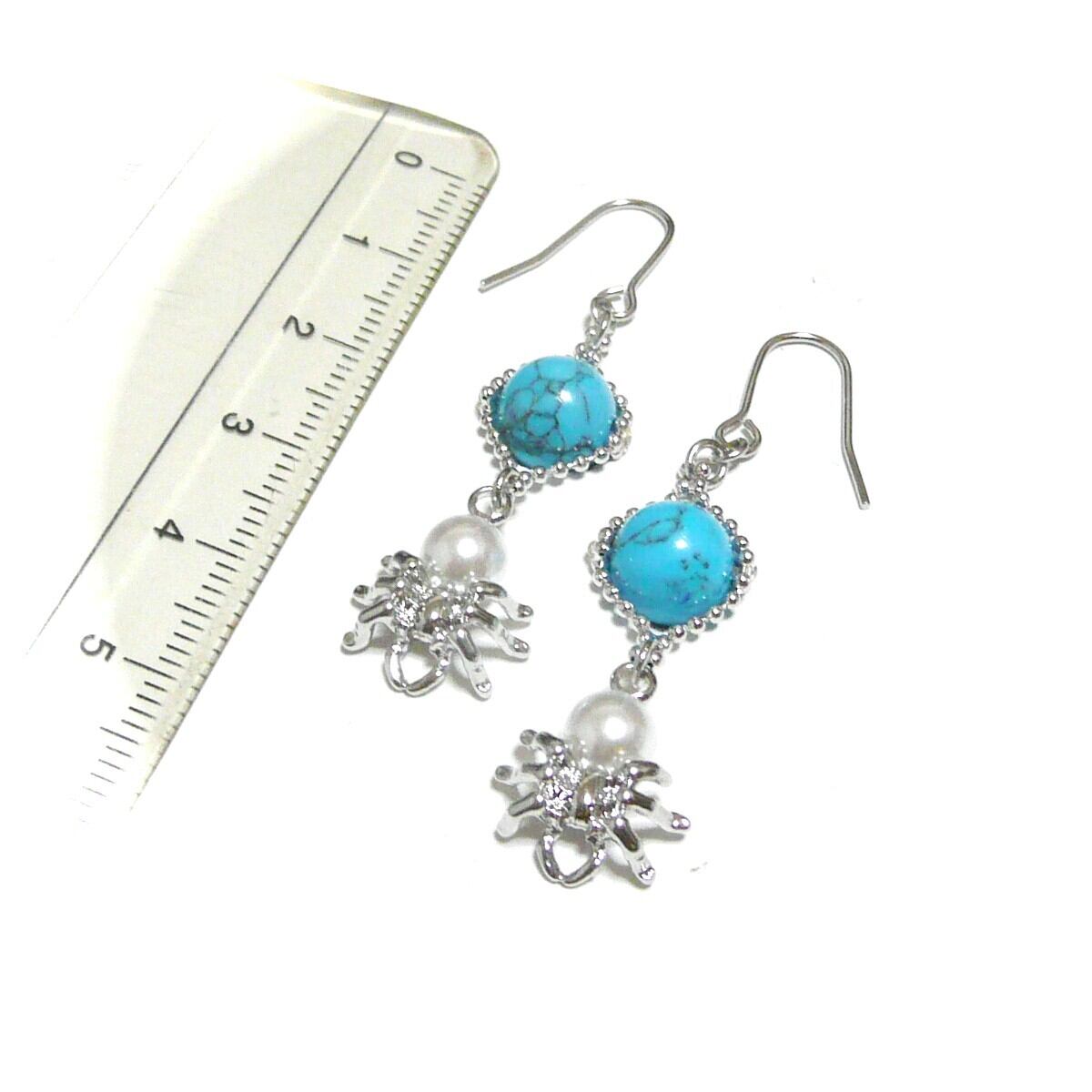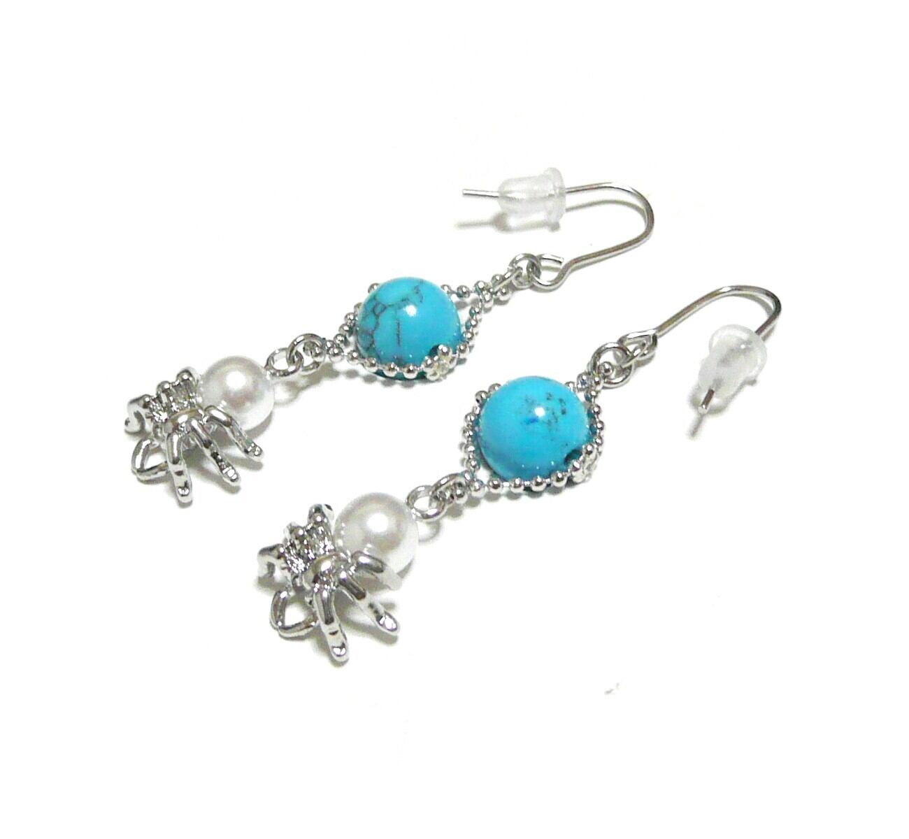 ターコイズ ピアス 蜘蛛 パール トルコ石 真珠クモ 銀色 シルバーカラー