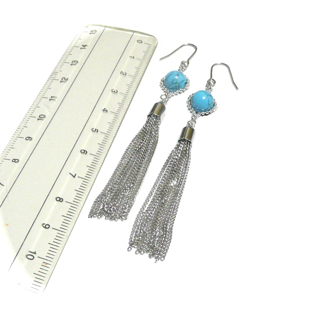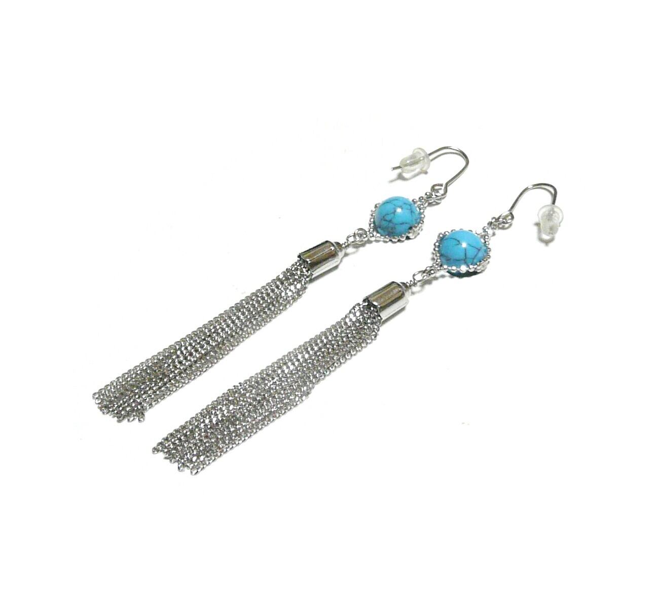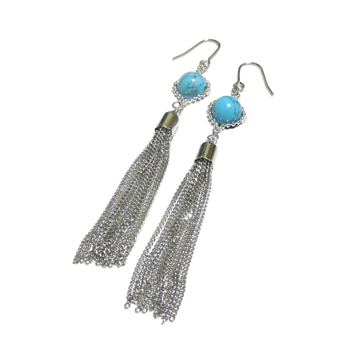 ターコイズ タッセル ピアス 房 ロングフリル トルコ石 8mm 丸珠 銀色 シルバーカラー