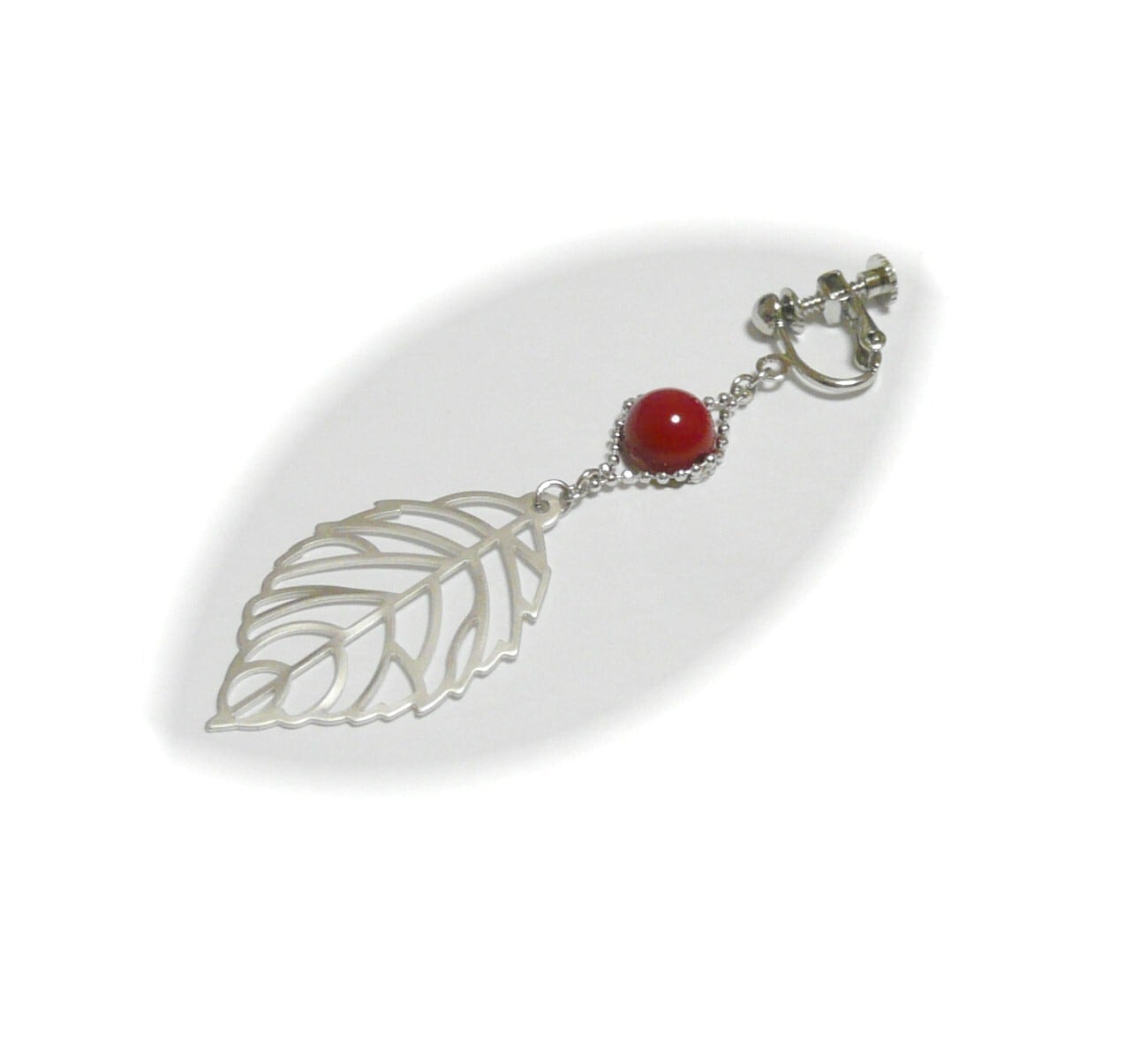 赤珊瑚 イヤリング 大きな葉っぱ リーフ さんご コーラル 銀色 シルバーカラー
