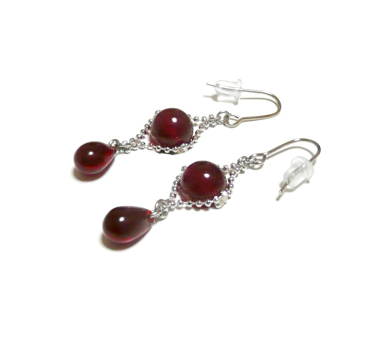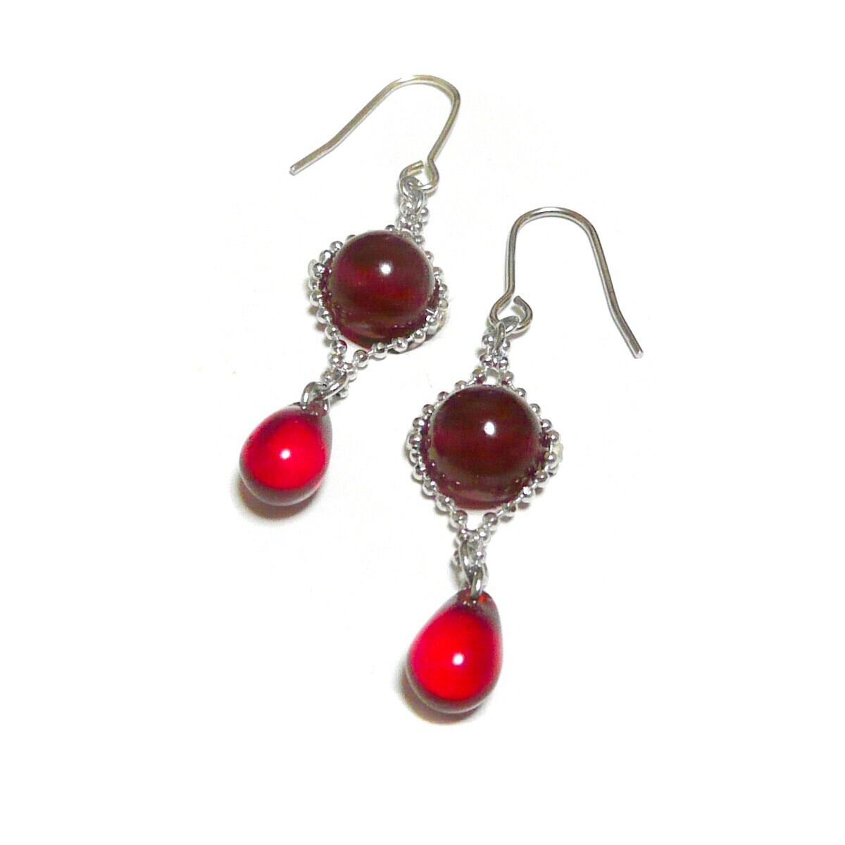 ルビー と 赤い琥珀 ピアス レッドアンバー しずく 銀色 シルバーカラー 【 人魚姫の涙 】