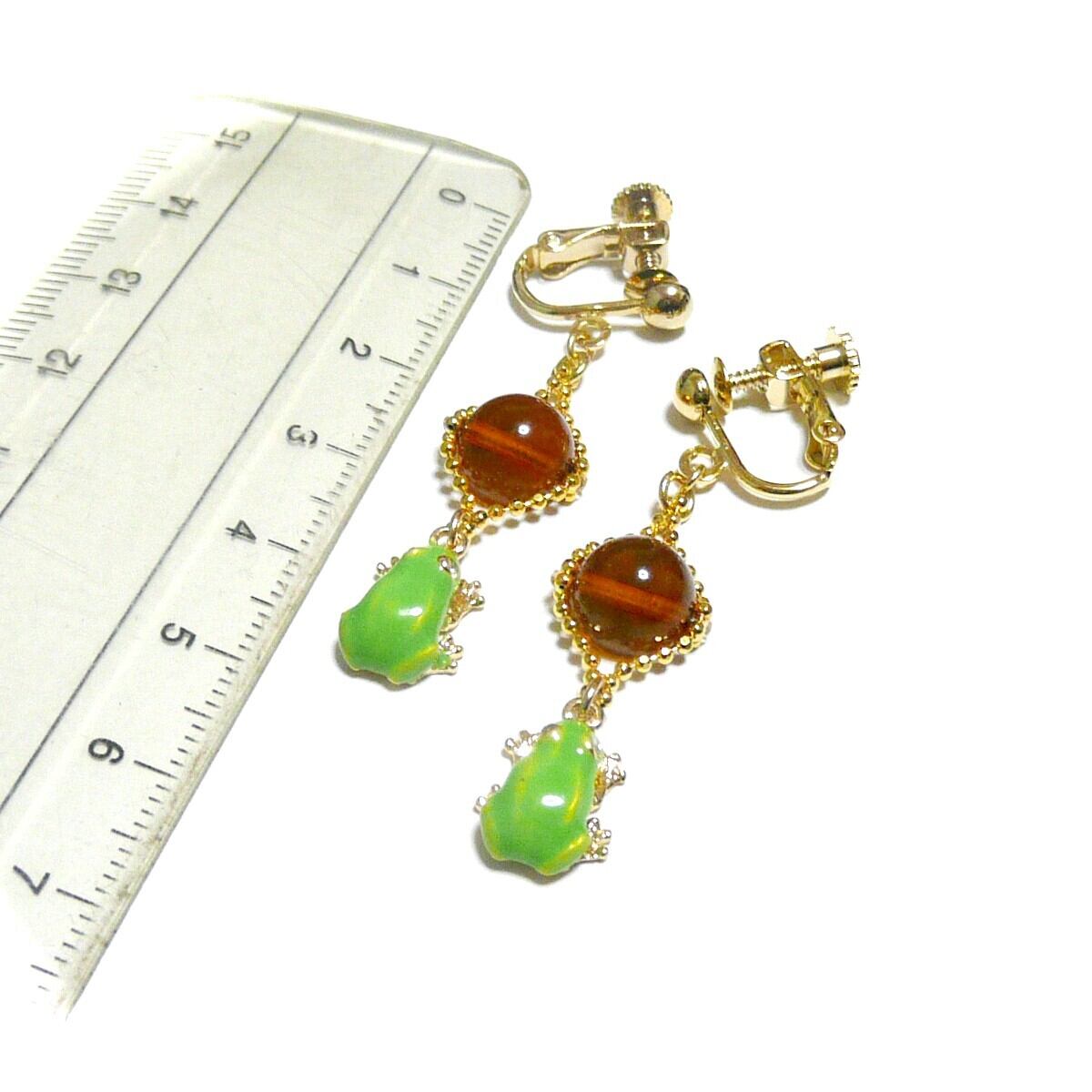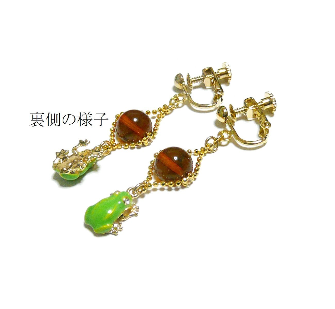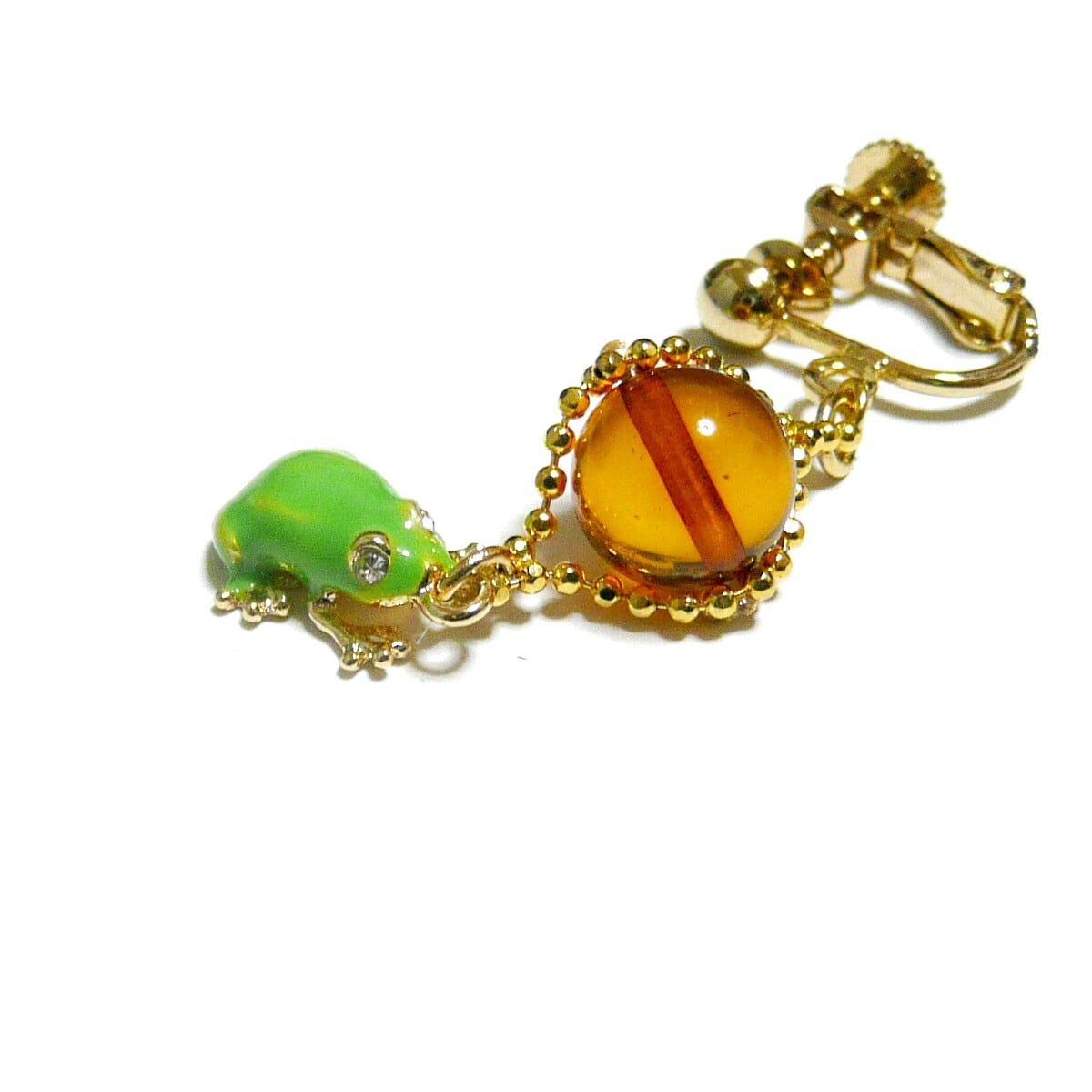 アマガエル イヤリング 琥珀 アンバー 8mm 蛙チャーム 金色 ゴールドカラー 【 かえる ぴょん 】