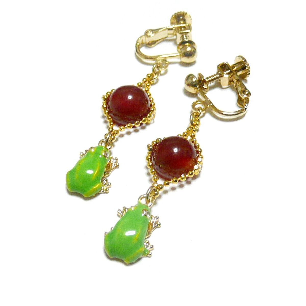 アマガエル イヤリング カーネリアン オレンジ 8mm 蛙チャーム 金色 ゴールドカラー 【 かえる ぴょん 】