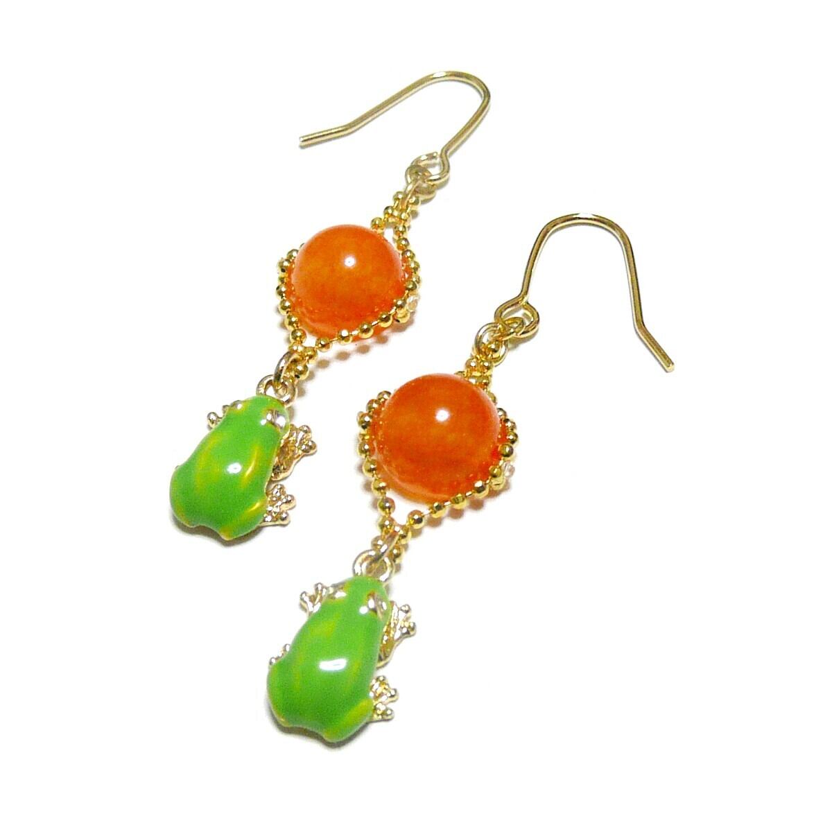 アマガエル ピアス オレンジカルセドニー 橙 玉髄 8mm 蛙チャーム 金色 ゴールドカラー 【 かえる ぴょん 】