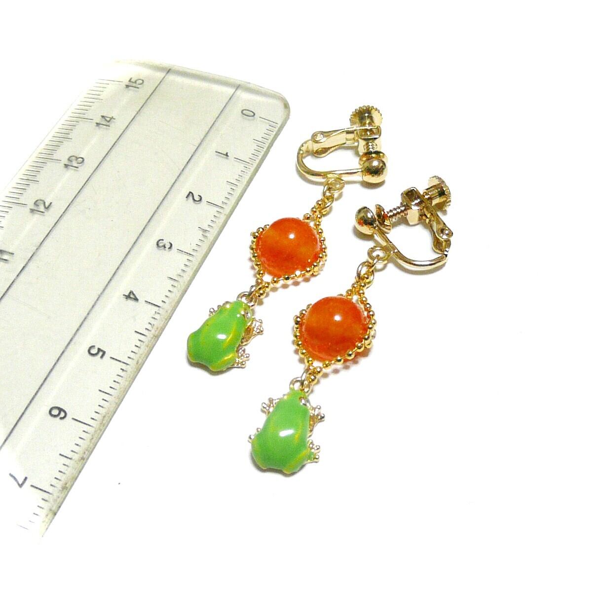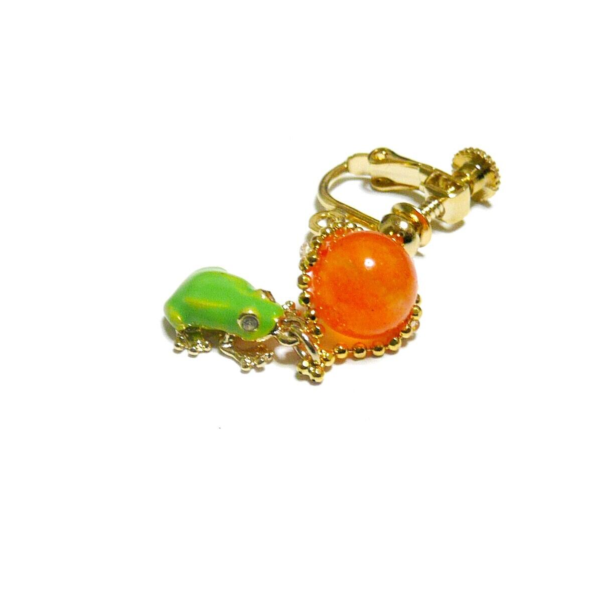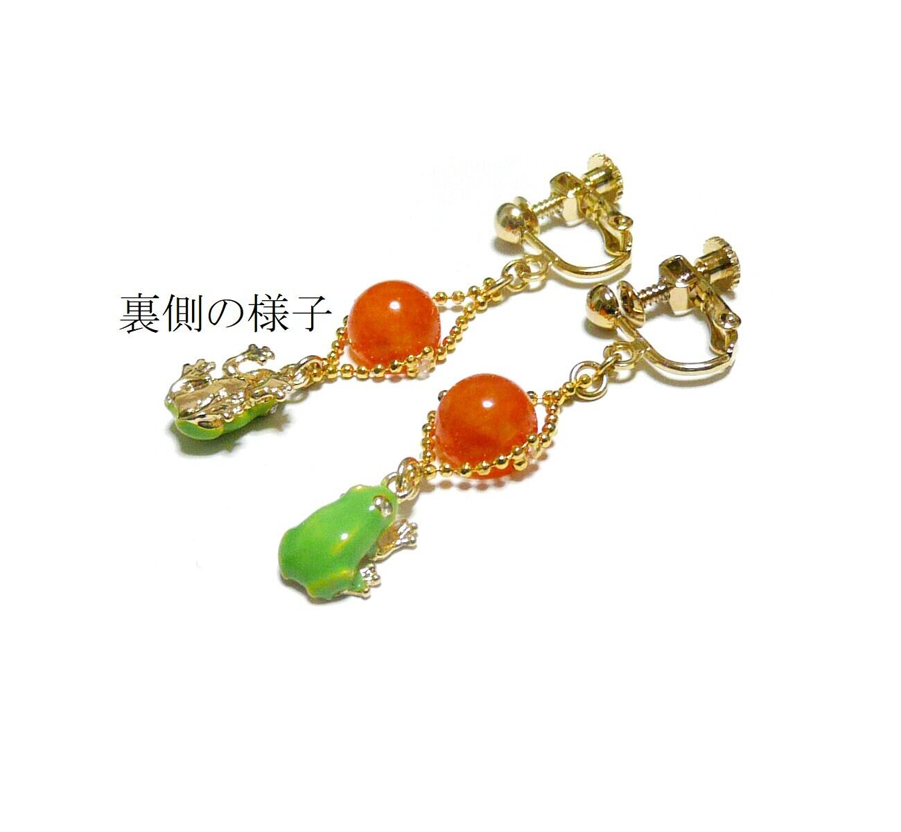 アマガエル イヤリング オレンジカルセドニー 橙 玉髄 8mm 蛙チャーム 金色 ゴールドカラー 【 かえる ぴょん 】