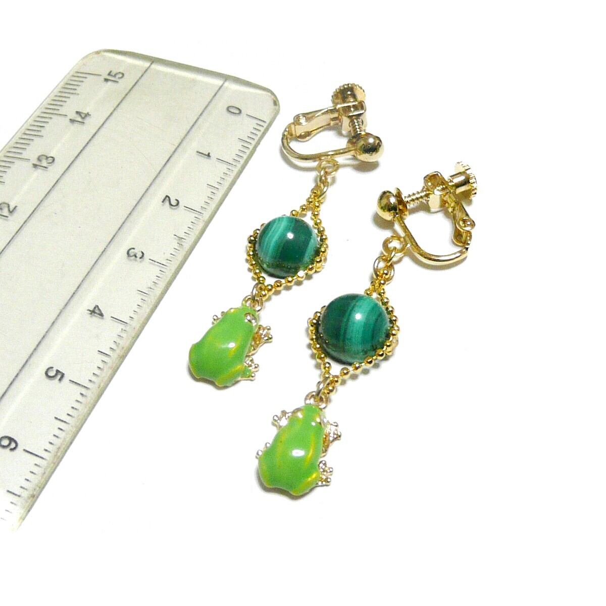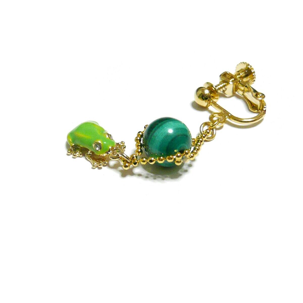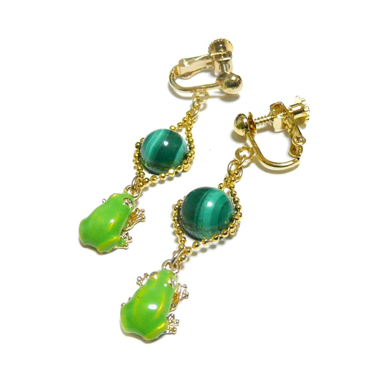 アマガエル イヤリング マラカイト 孔雀石 8mm 蛙チャーム 金色 ゴールドカラー 【 かえる ぴょん 】