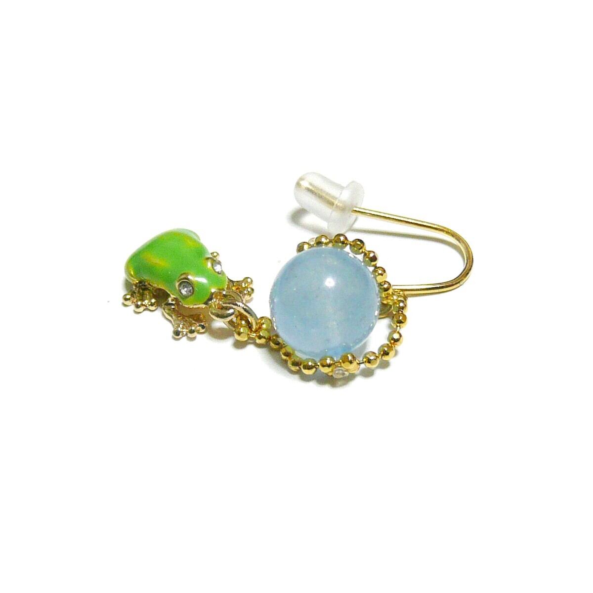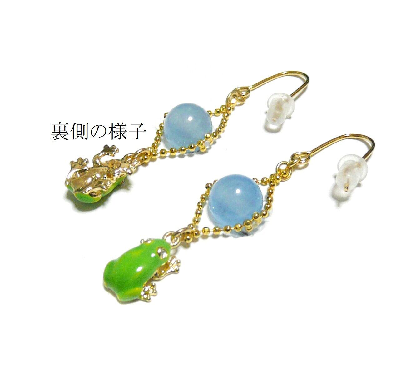 アマガエル ピアス アクアマリン 藍玉 8mm 蛙チャーム 金色 ゴールドカラー 【 かえる ぴょん 】