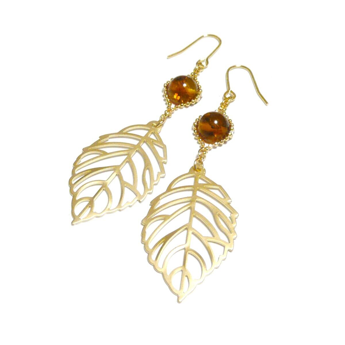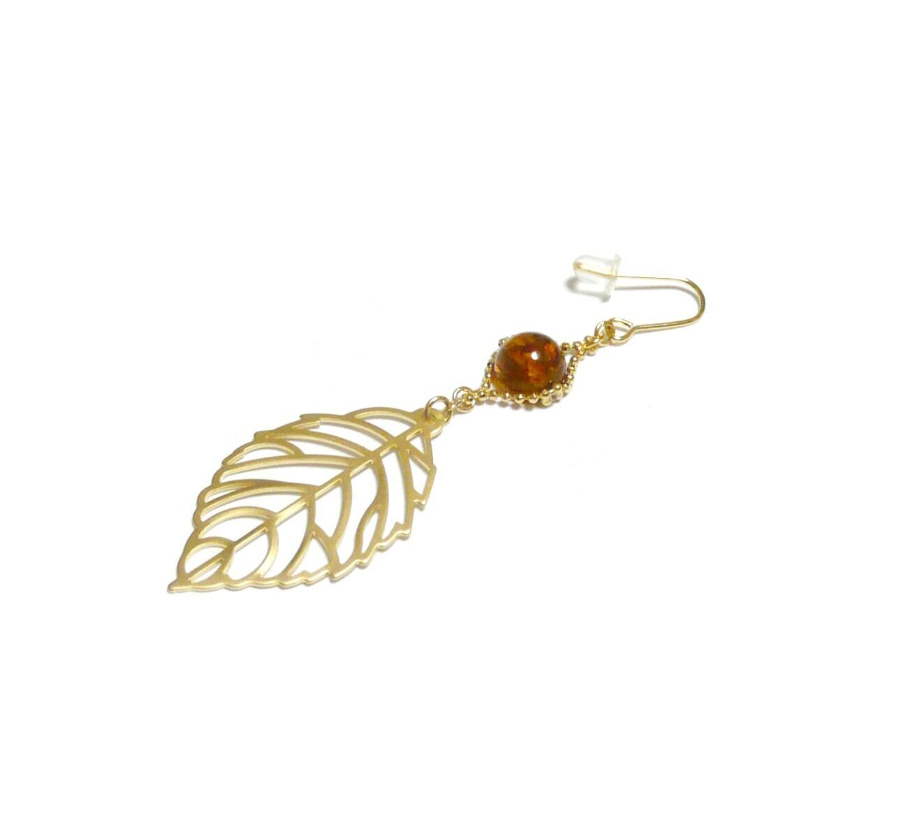 琥珀 ピアス 大きな葉っぱ リーフ こはく アンバー 金色 ゴールドカラー