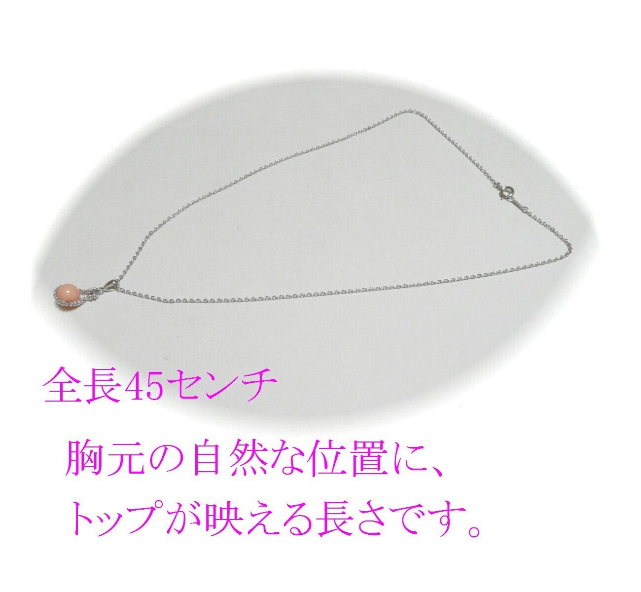 胸元の自然な位置にトップが映える長さです。