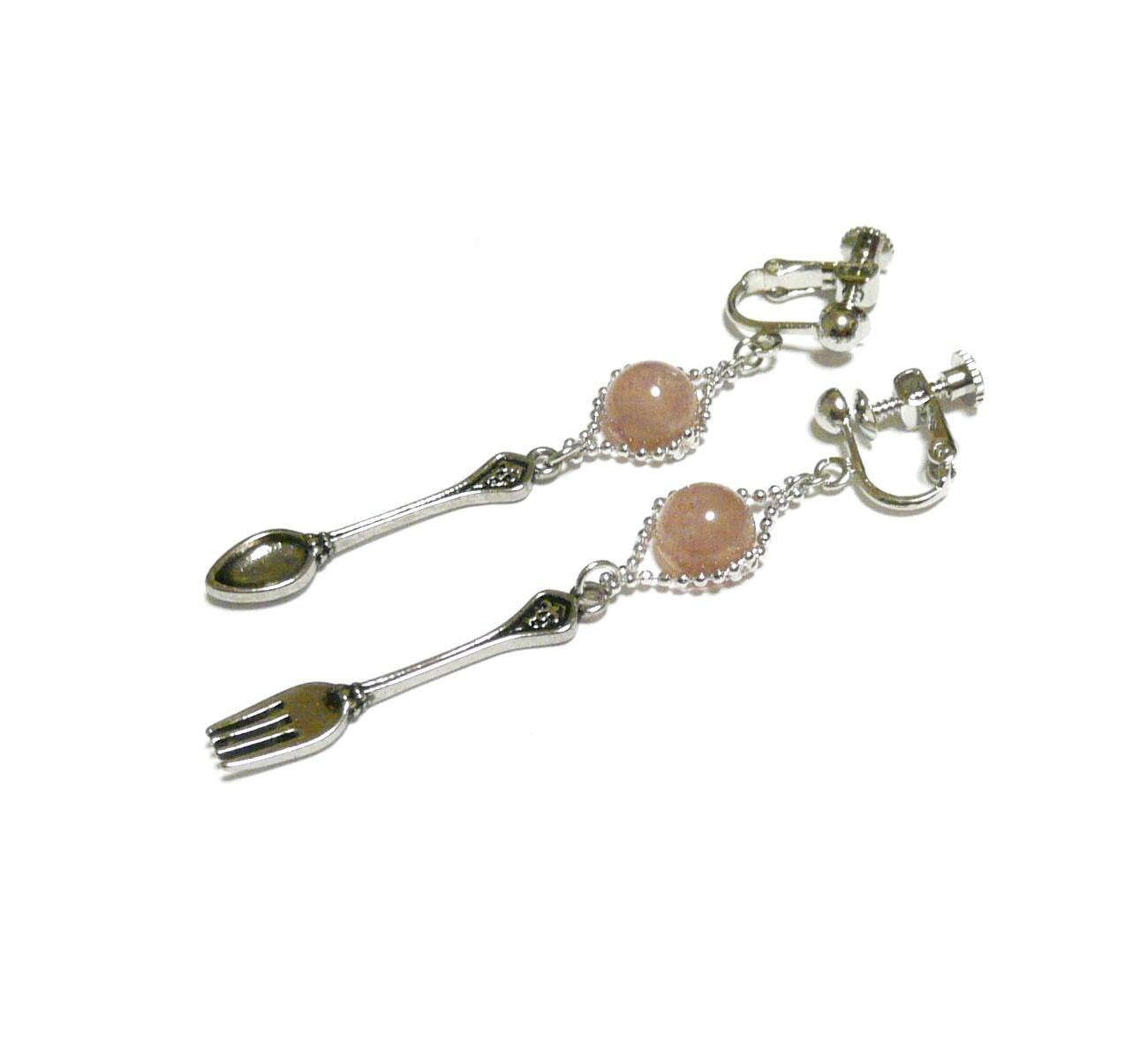 食器のチャームと共に揺れるユニークなイヤリングです。